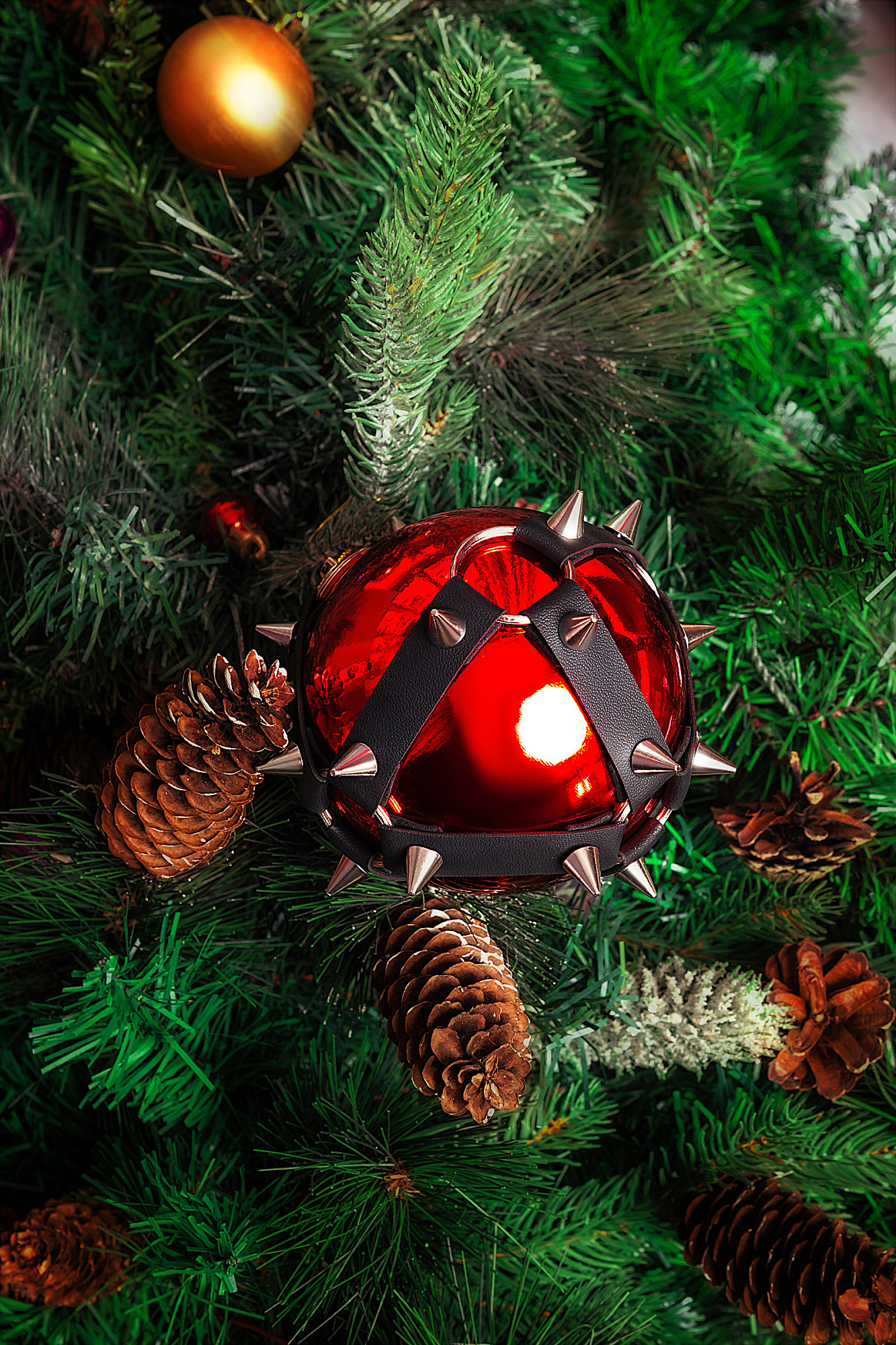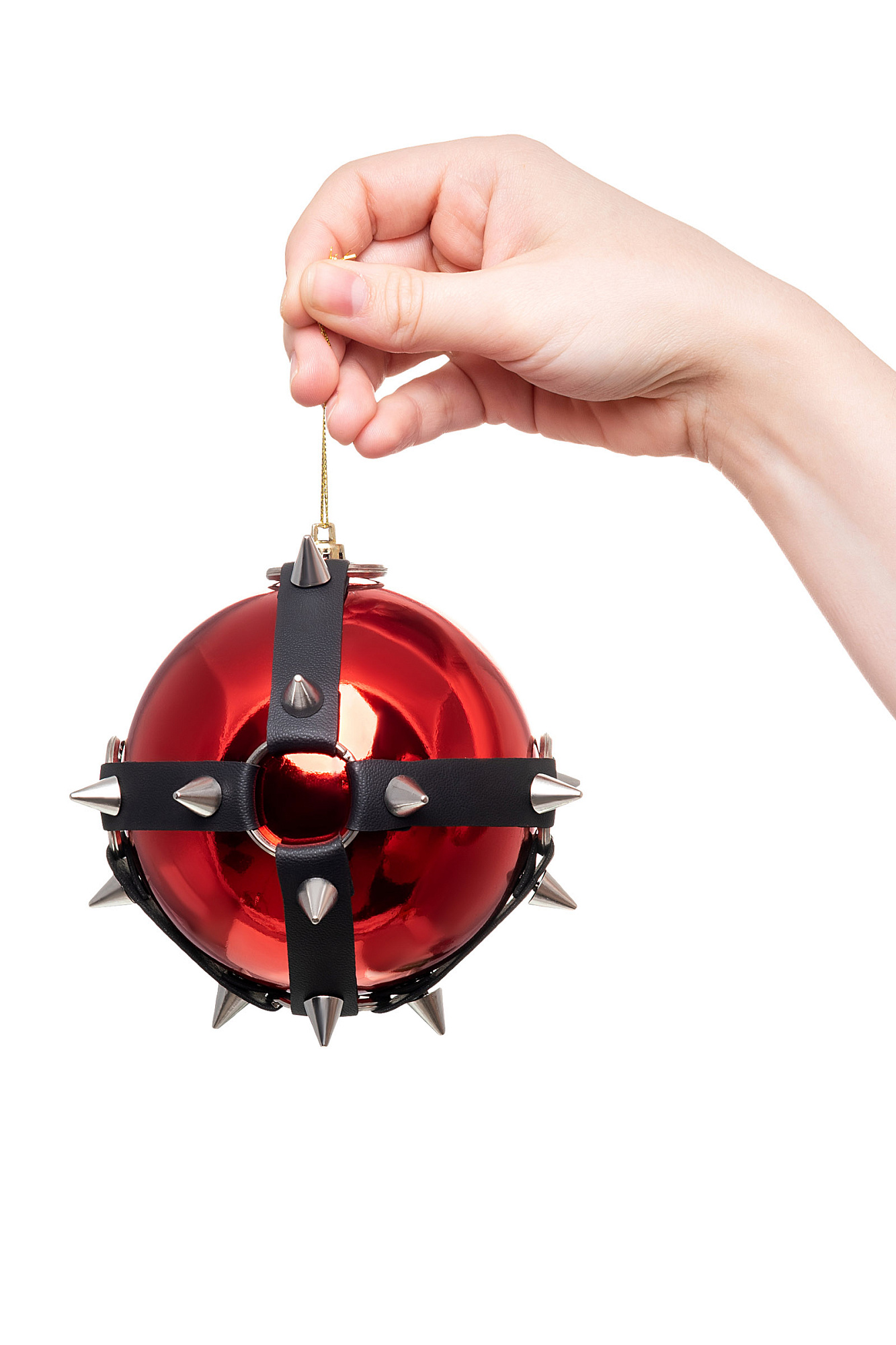 Глянцевый шар огненно-красного цвета изготовлен из качественного, прочного пластика. Кожаные ремни по всей поверхности выполнены из натурального, экологичного материала. 22 элемента стальной фурнитуры дарят новогоднему украшению манящий эффект. Универсальный размер 100мм подходит как для миниатюрных, так и для больших елочек. Ароматная кожа, стальные шипы, металлические кольца – все в лучших традициях классического БДСМ.