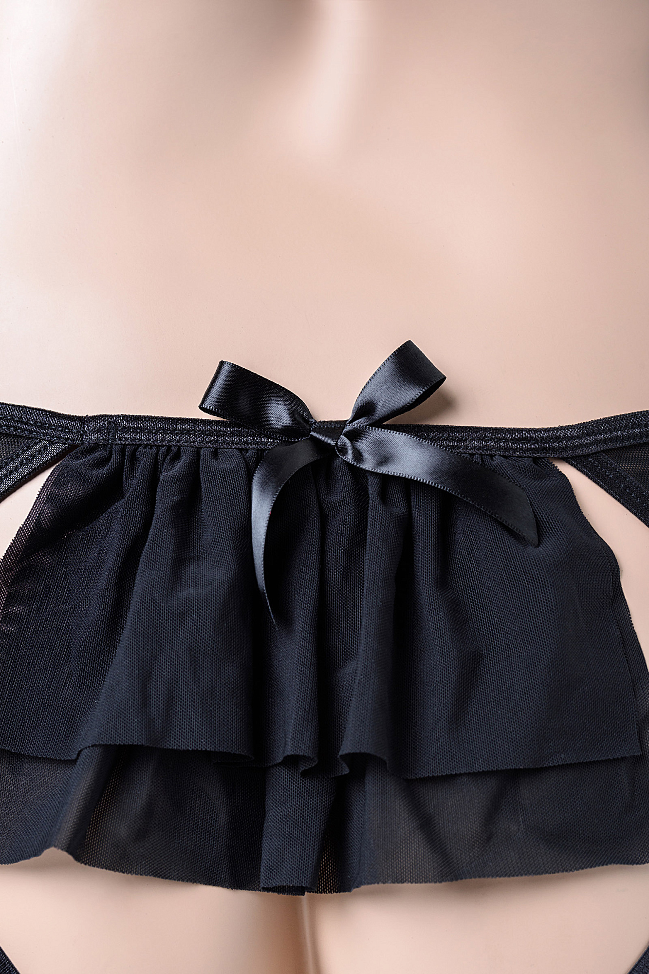 Мягкий комплект из комбинированных материалов. Бюстгальтер с застежкой спереди и регулируемыми бретелями. Металлическая застежка украшена стразами. Трусики-слипы с регулируемыми стрепами и оборки, украшенные сатиновым бантом, приковывают внимание к виду сзади.