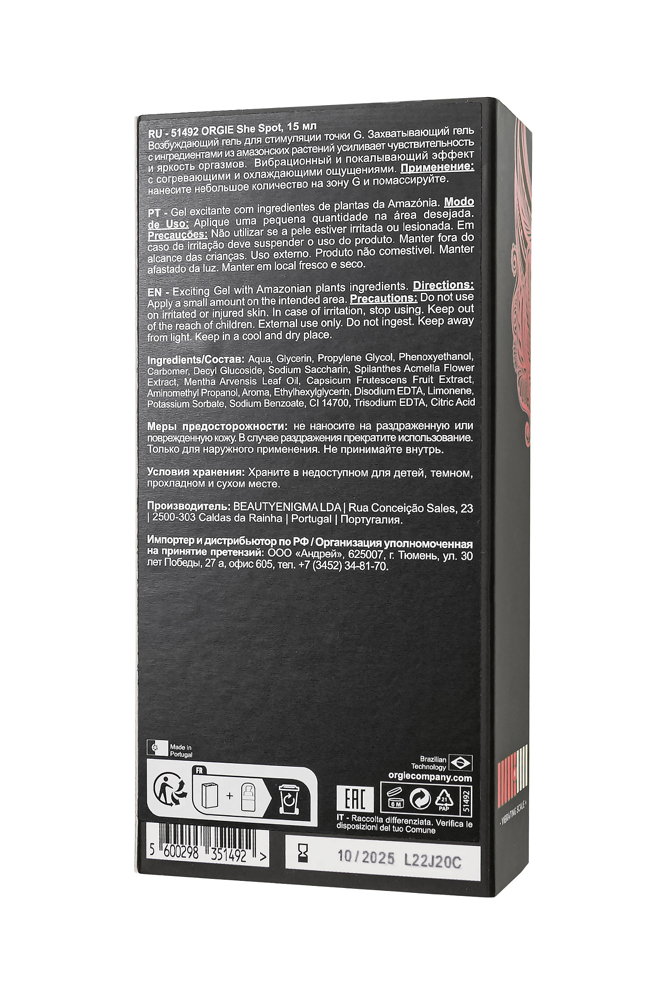 Интимный гель для точки G ORGIE She Spot – ваш путь к невероятным ощущениям. Этот гель создан для удовольствия. Забудьте о рутине и откройте новый мир возможностей с интенсивным вибрационным и покалывающим эффектом. Формула She Spot, обогащенная активными ингредиентами, приносит непередаваемые ощущения, которые усиливаются развивающимися согревающими, охлаждающими и даже легкими пряными нотками. В этот момент вы ощущаете нечто невероятное, словно погружаясь в водопад наслаждения.