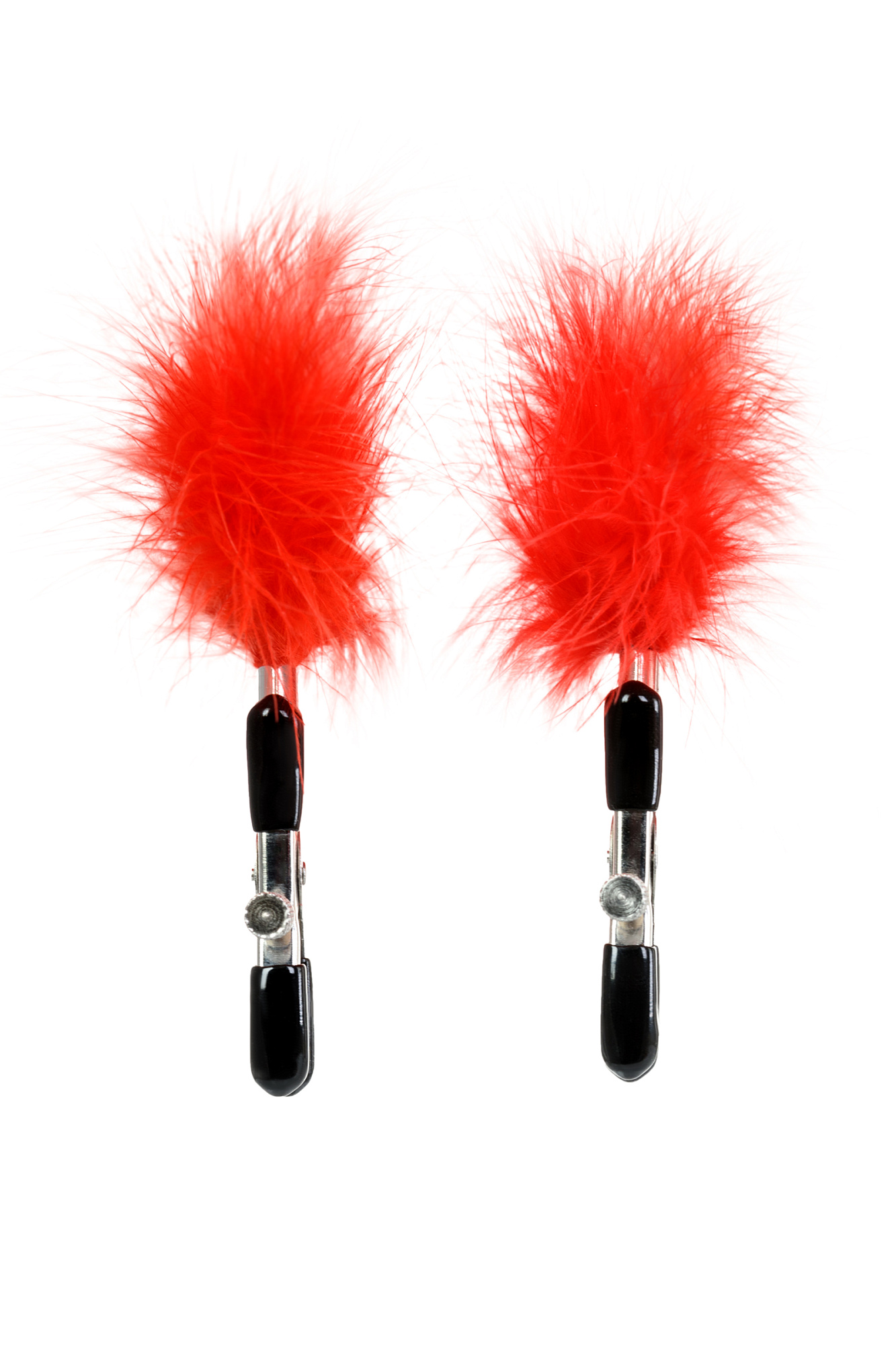 Пожалуй, самые милые из всех зажимов - украшенные перьями. Они стимулируют не только сжатием сосков, но и щекочут грудь. Сдавливание регулируется болтиком и может быть усилено или уменьшено во время интимной игры. Покрытие на концах зажимов защищает нежную кожу.